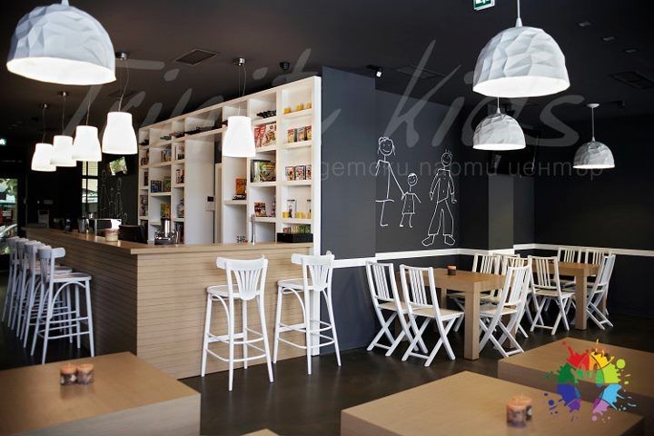 Tyylikkäässä kahvilassa, jossa on ilmainen WiFi, tarjoillaan cocktaileja ja juomia, ja se on vanhempien käytössä odottaessaan lapsiaan.